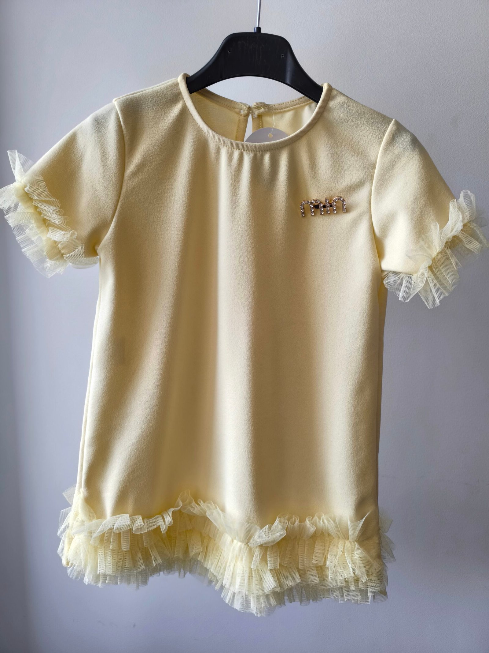 Suknelė su tiulio juostelių detalėmis, MĖTINĖS/ŠVELNIAI ŽALIOS spalvos, su „min” ženkliuku (dydžiai: 3-14 metų)20.00€